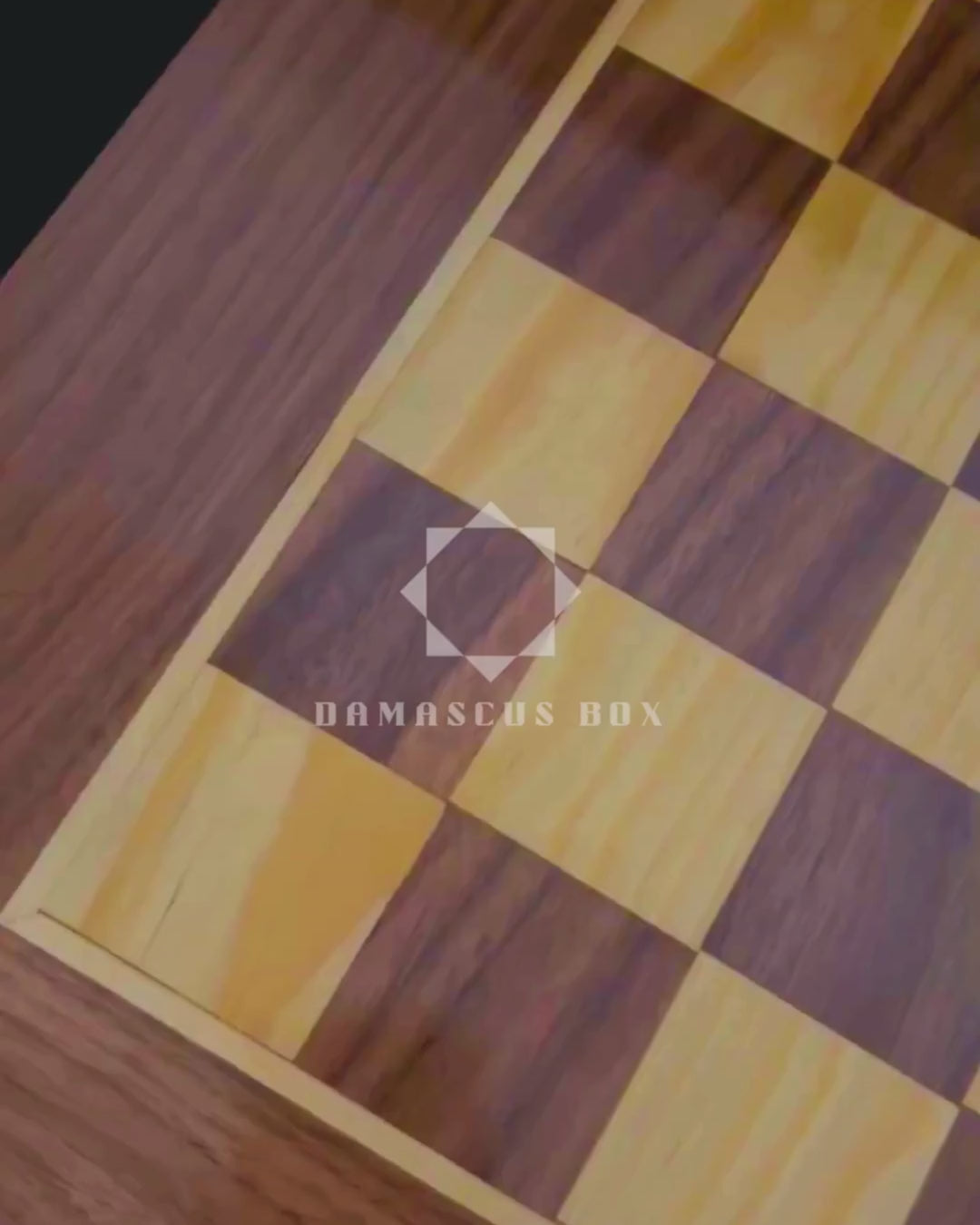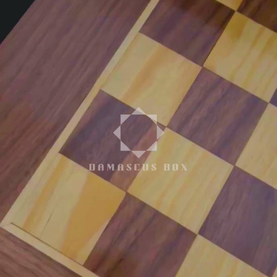 La superficie exterior presenta un tablero de ajedrez clásico, mientras que el interior revela un impresionante diseño de mosaico damasquino — una expresión de siglos de arte y tradición.