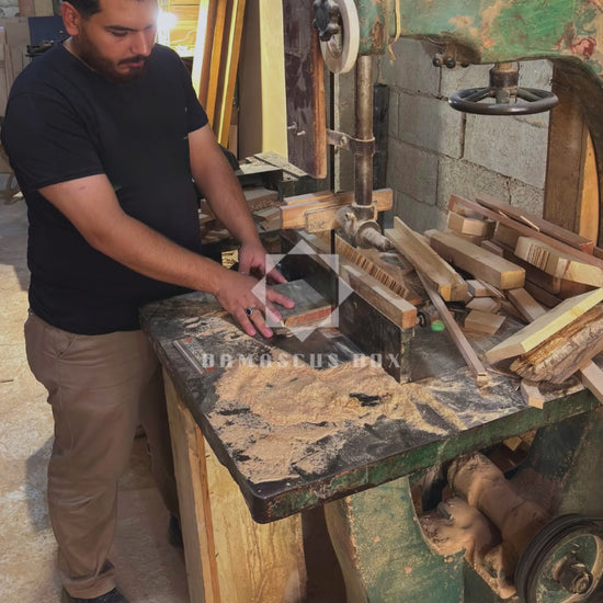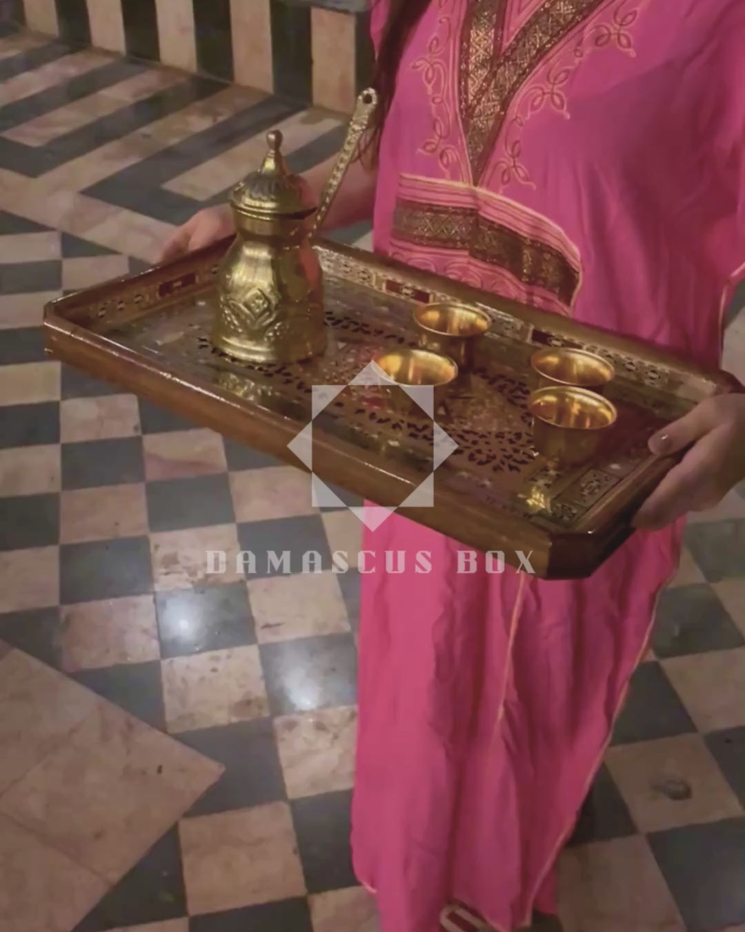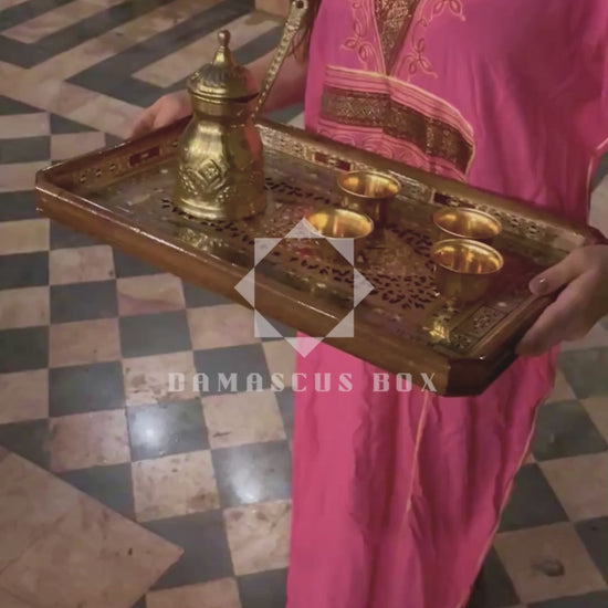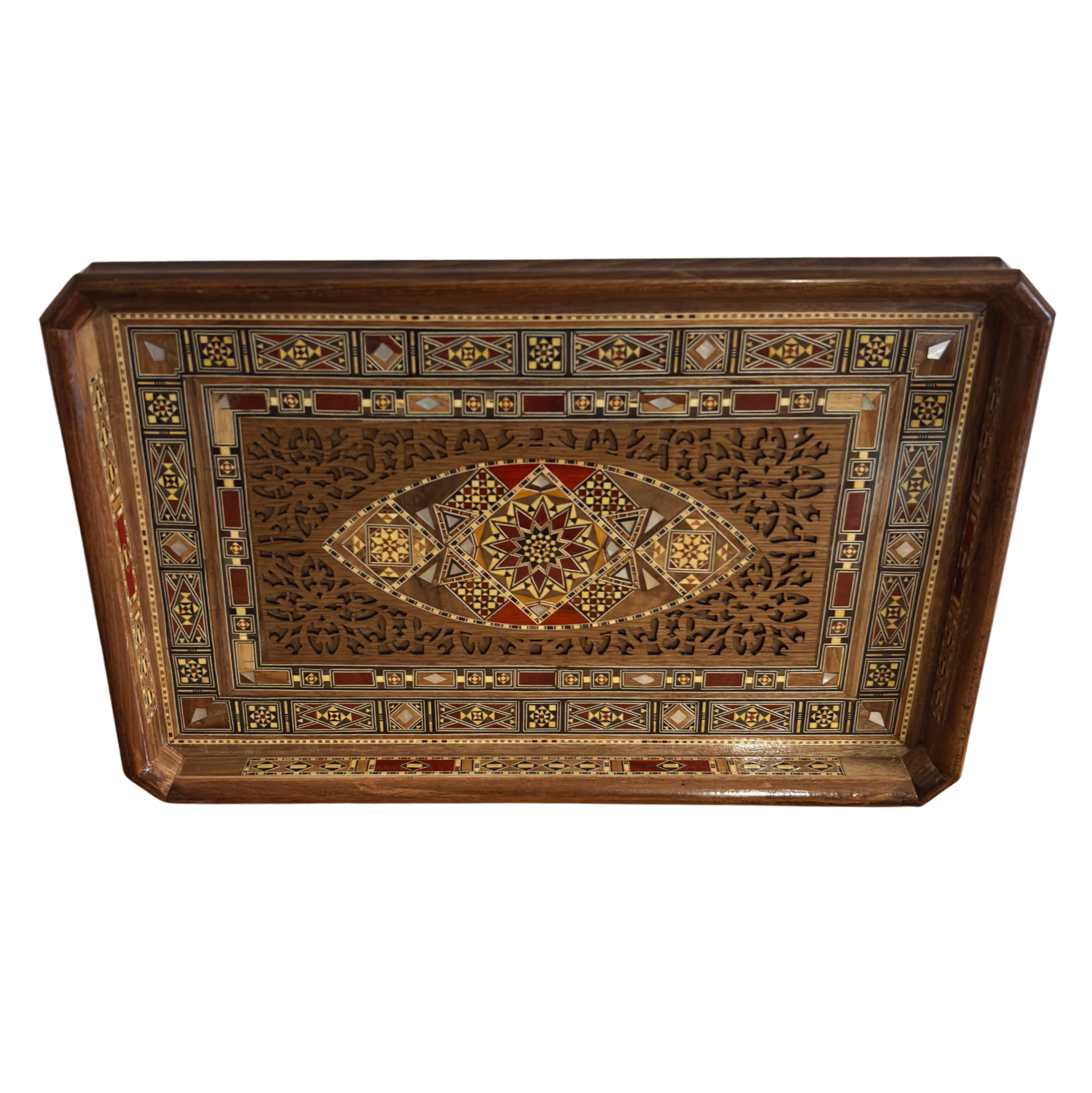 plateau damasquiné, nacre naturelle, bois artisanal, design sculpté, art oriental, artisanat syrien, Damascus Box