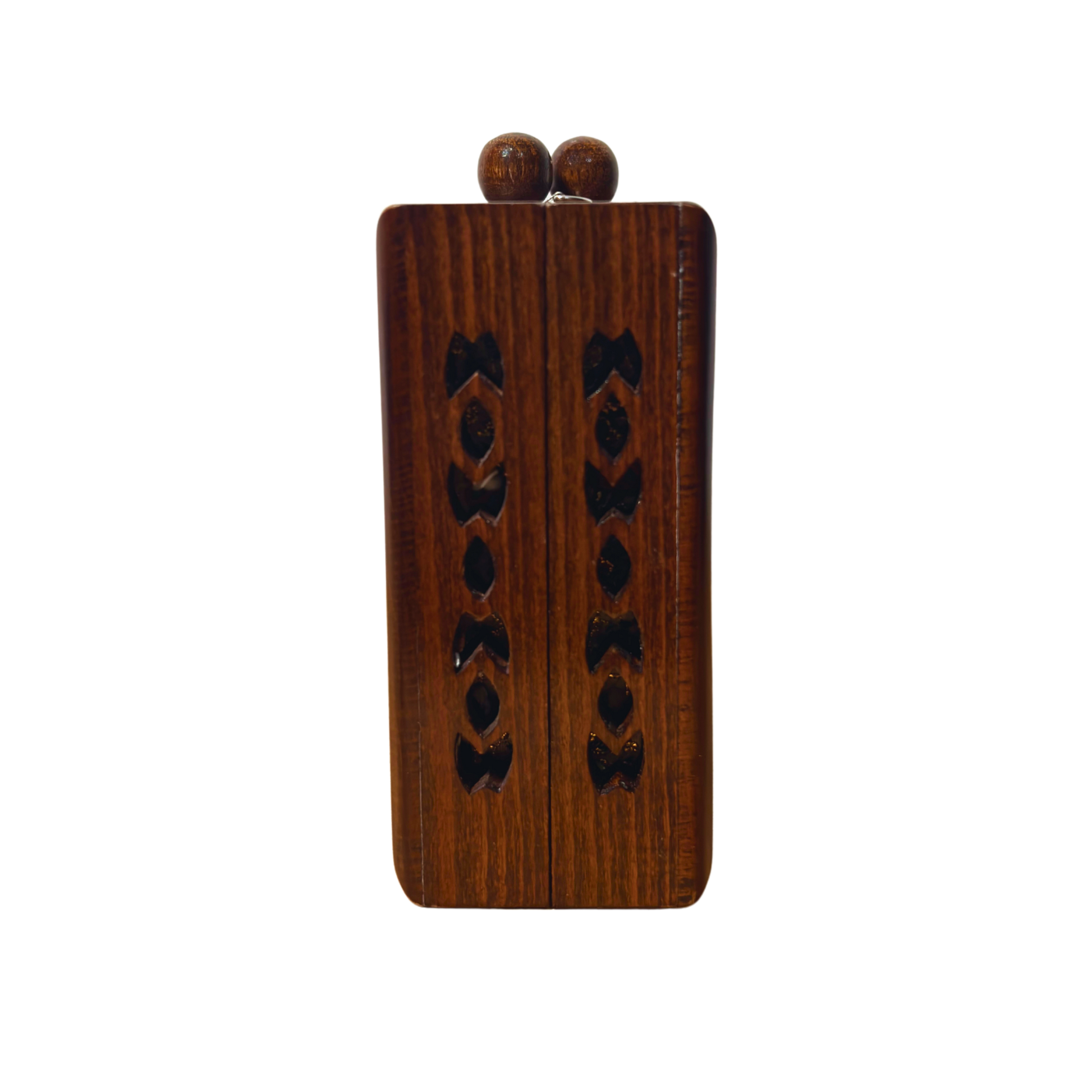 Gefertigt aus edlem Walnussholz und verziert mit schimmerndem Perlmutt, steht diese Clutch für feine Handwerkskunst aus Damaskus. Die abnehmbare Perlenkette ermöglicht sowohl das Tragen über der Schulter als auch als elegante Handtasche.