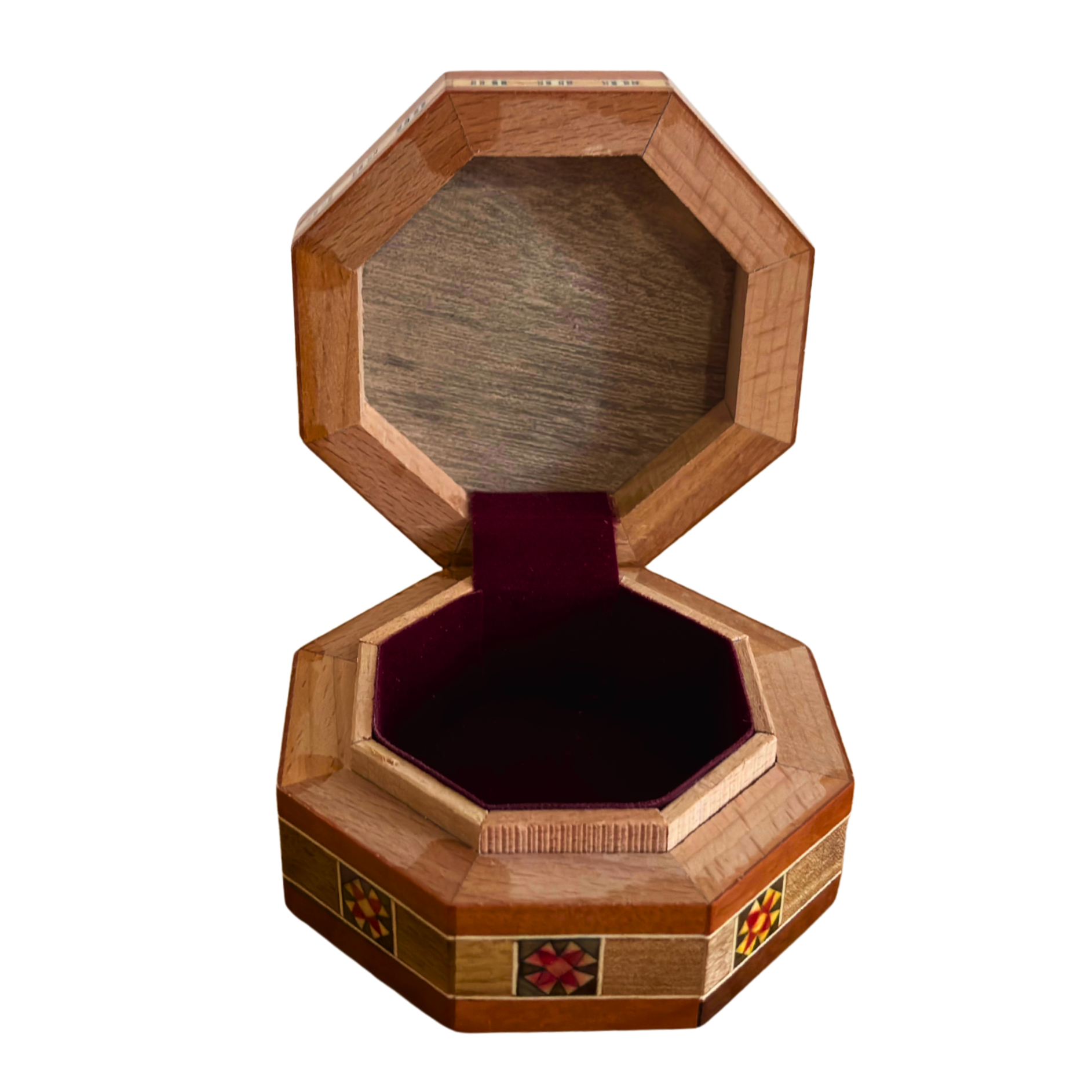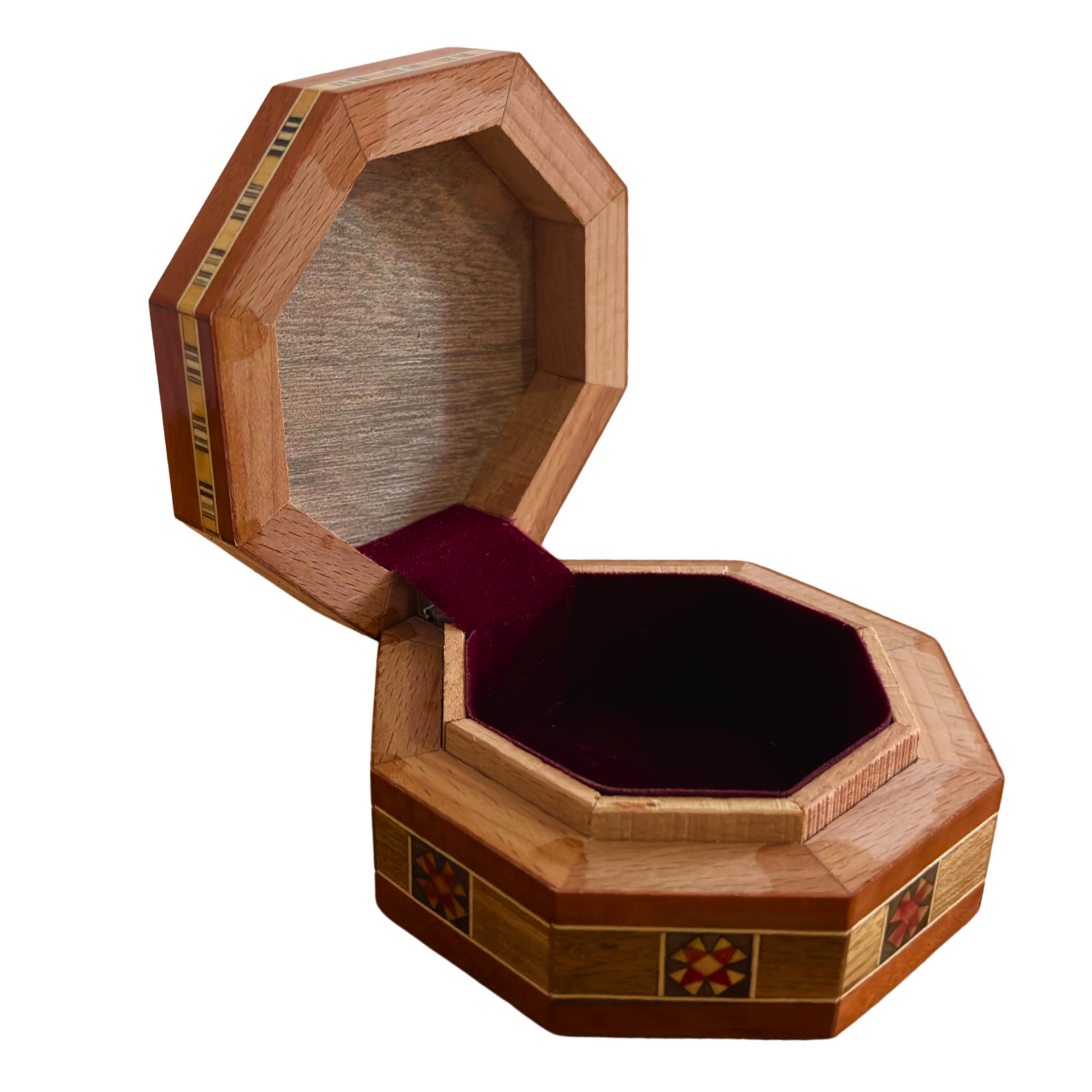 Achteckige damaszener Schmuck-Mosaikbox – handgefertigtes Holz mit Perlmutt-Einlegearbeit in warmem rustikalem Terrakotta