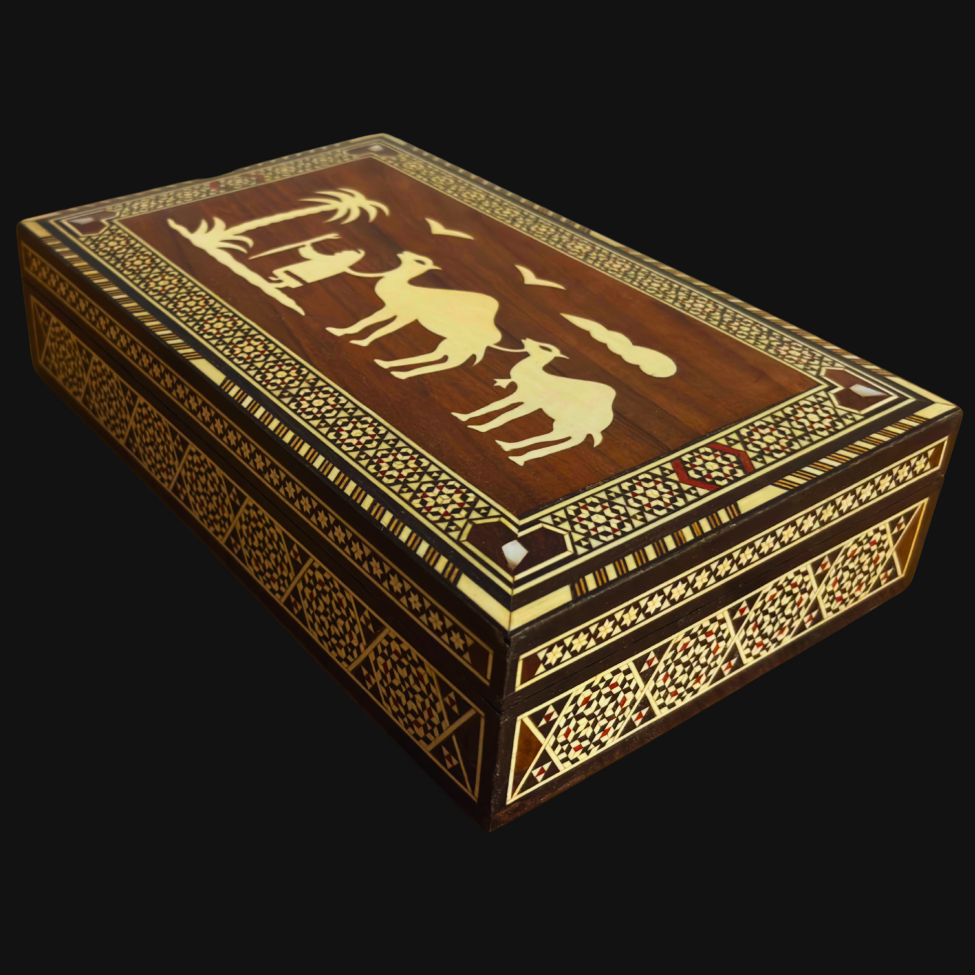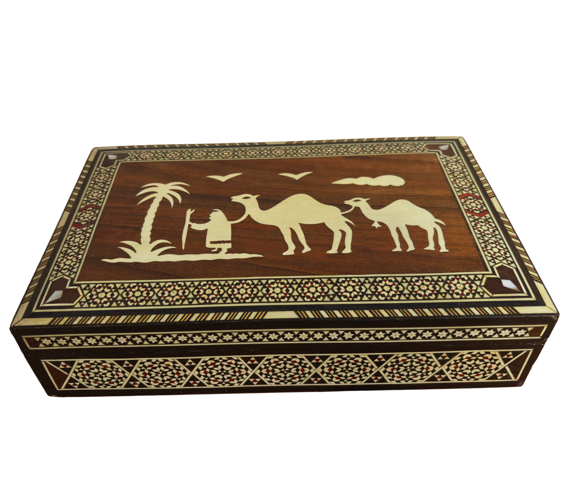 vintage Kamel-Mosaikschatulle, handgefertigte Damaszener Schachtel, Perlmutt-Schmuckschatulle, Beduinen-Wüstenszene Schatulle, syrische Mosaik-Holzschatulle, 1970er Vintage Geschenk, orientalische Handwerkskunst, Geschenk für Sie, orientalische Schmuckschatulle, Wüstenthema Andenken, Damascus Box, syrische Schatulle, Geschenk für Sie, Geschenk für Ihn