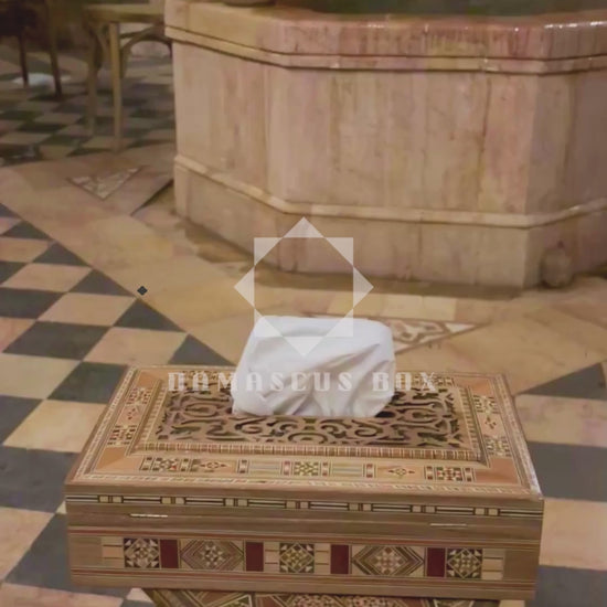 Esta elegante caixa de lenços feita à mão reflete a tradição e a harmonia do trabalho em madeira de Damasco.