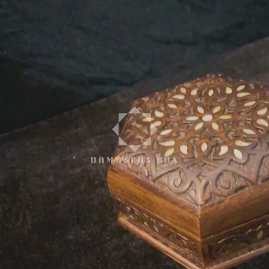el oyma kutu, sedef kakmalı kutu, şam el işi, altıgen ahşap kutu, lüks hediye, Damascus Box