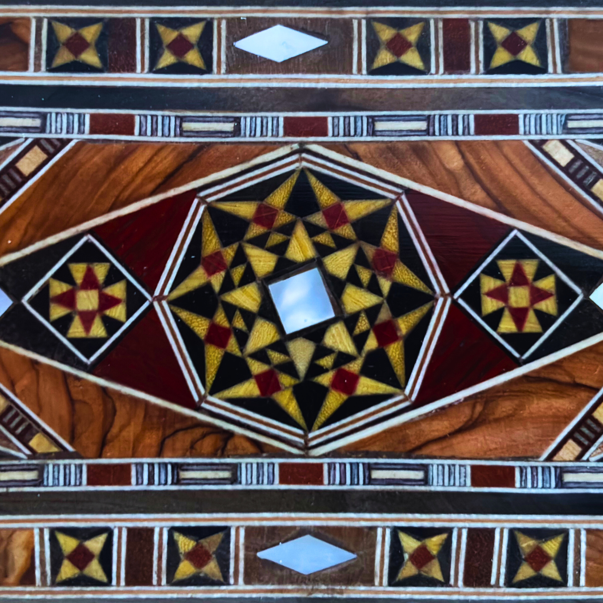 el yapımı mozaik ahşap kutu, uzun dikdörtgen kakmalı kutu, sedef kakmalı kalem kutusu, Suriye mozaik takı kutusu, ahşap hatıra kutusu, zarif el yapımı hediye, Arap geometrik dekor, oriental sanat kutusu, zanaatkâr saklama kutusu, Şam kutusu, Suriye kutusu, ona hediye, ona hediye